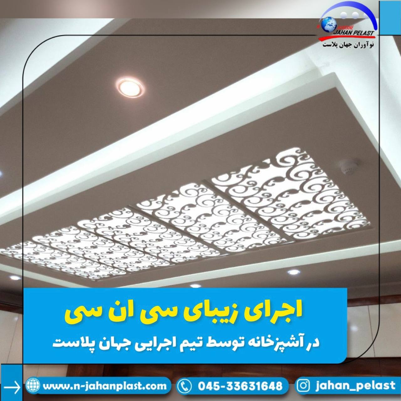 نوآوران جهان پلاست در اردبیل با تجربهای حرفهای، آماده ارائه خدمات مشاوره، طراحی، فروش و اجرای سقف کاذب CNC با بالاترین کیفیت و مناسبترین قیمت است. با ما تماس بگیرید تا سقف خانهتان، زیباترین قاب دکوراسیونتان شود.